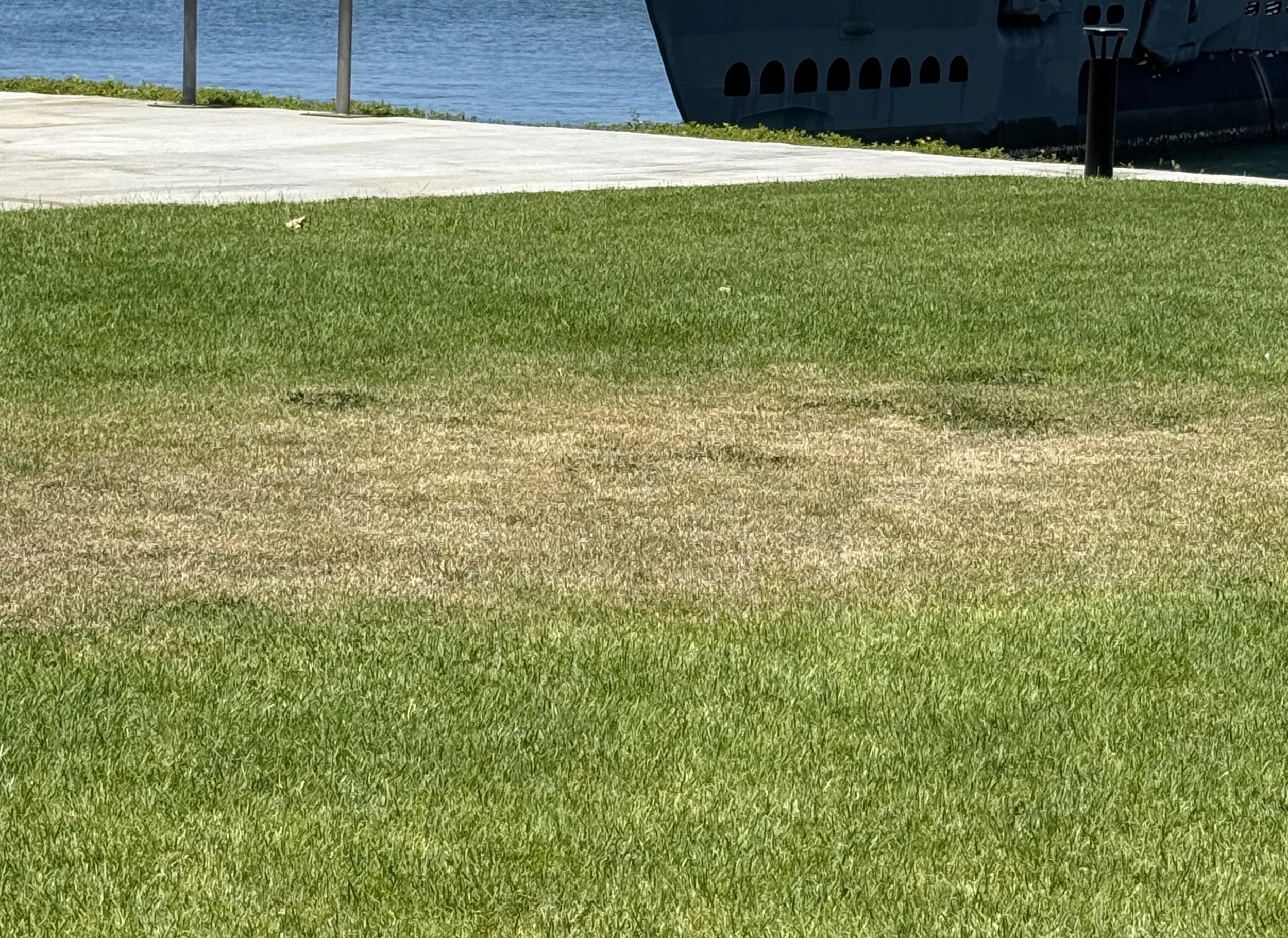 Photo 5. Yellow patch of damaged turfgrass by grubs