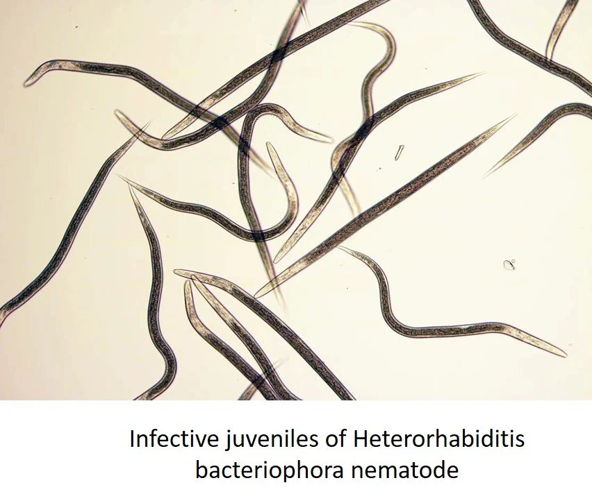 Beneficial Heterorhabditis bacteriophora nematodes are microscopic, soil-dwelling roundworms that naturally occur in healthy ecosystems and are also commercially available. These nematodes are entomopathogenic, meaning they carry insect-pathogenic bacteria used to kill soil-dwelling insect pests, including the grubs of various beetle species. They are completely safe for humans, pets, plants, and the environment.